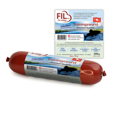 Trainingswurst 99% Lachs aus Schweizer Tierhaltung mit Galacum und Käse. Eine aussergewöhnliche Trainingswurst, leicht verdaulich und bekömmlich. Ein Leckerbissen für jeden Liebling. Hergestellt in der Schweiz mit Schweizer Rohstoffen.